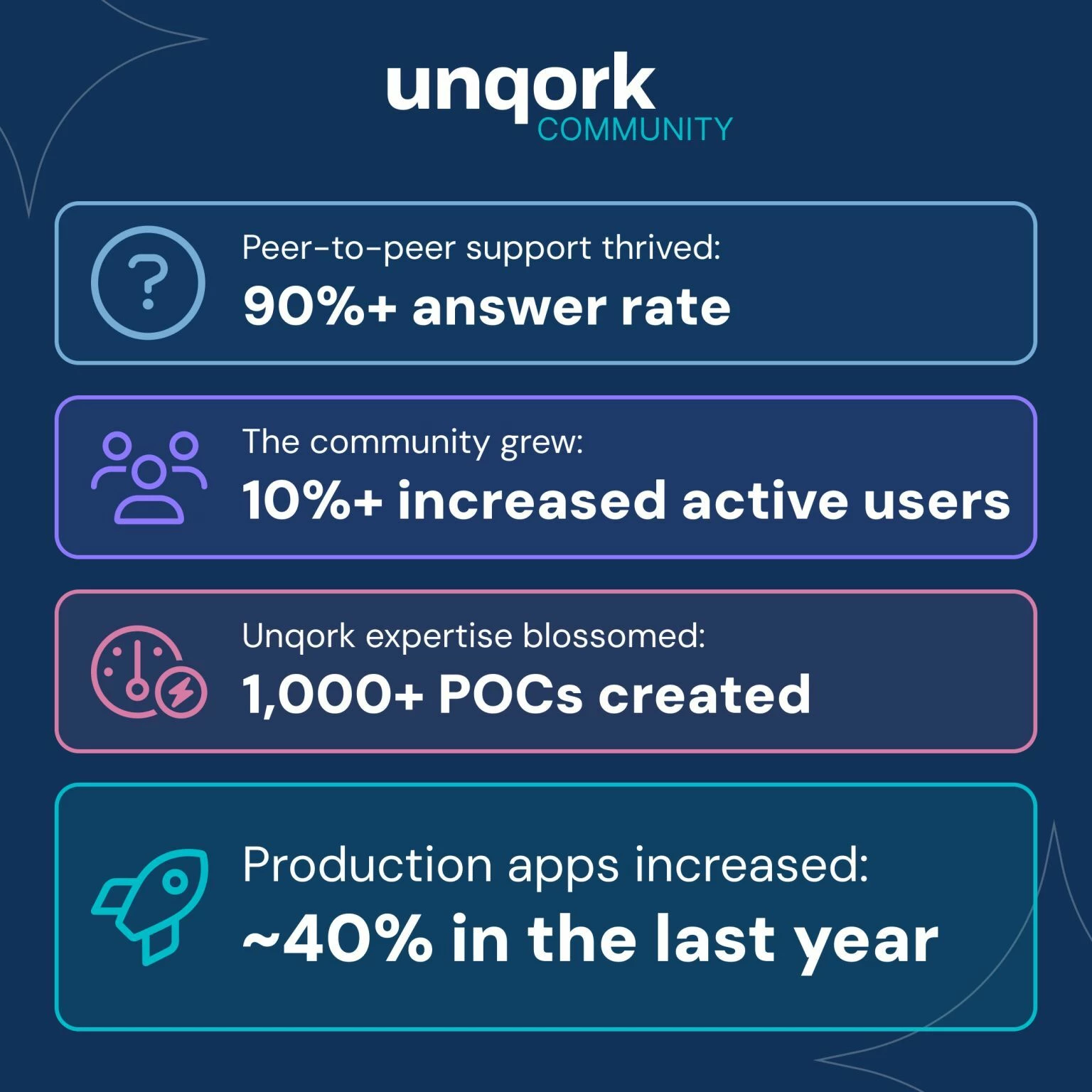 ✅ 90%+ answer rate 📈 10% community growth 💻 1,000+ Unqork POCs built